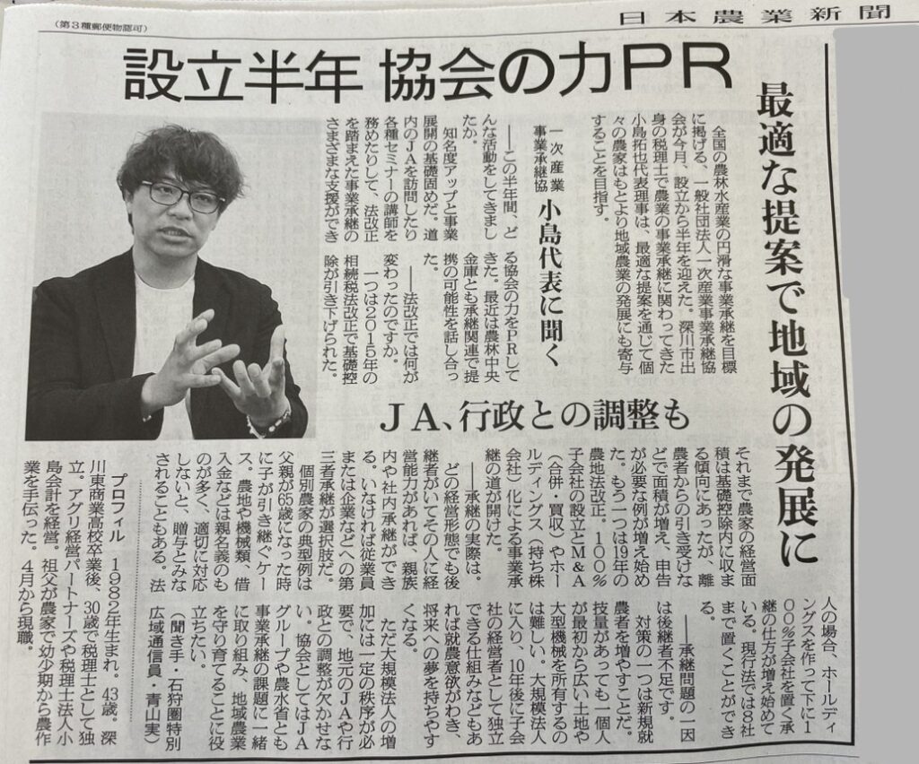 この度、当協会代表のインタビュー記事が農業の機関紙である日本農業新聞(2025年10月31日付)に掲載されました。当協会は2025年10月に、4月の設立から半年を迎え、引き続き、一次産業に従事する企業や個人が円滑に事業承継を行えるよう、関係団体と連携をしながら支援の輪を広げていく所存です。